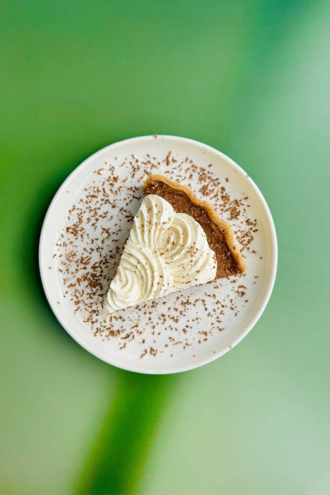 9. You can decorate the pie in several ways. One option is to spread whipped cream over the pie using the back of a spoon in swooping motions. Alternatively, you can transfer the whipped cream to a piping bag fitted with a large star tip (like Wilton 1M or 2D) and pipe rosettes around the edge in a clockwise circle or in any other pattern you prefer. Finally, scatter chocolate shavings over the whipped cream for extra pizzazz.
