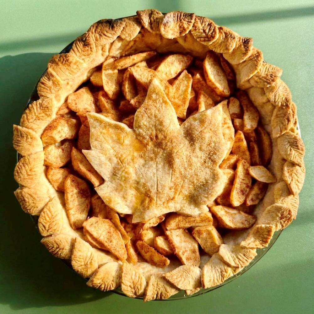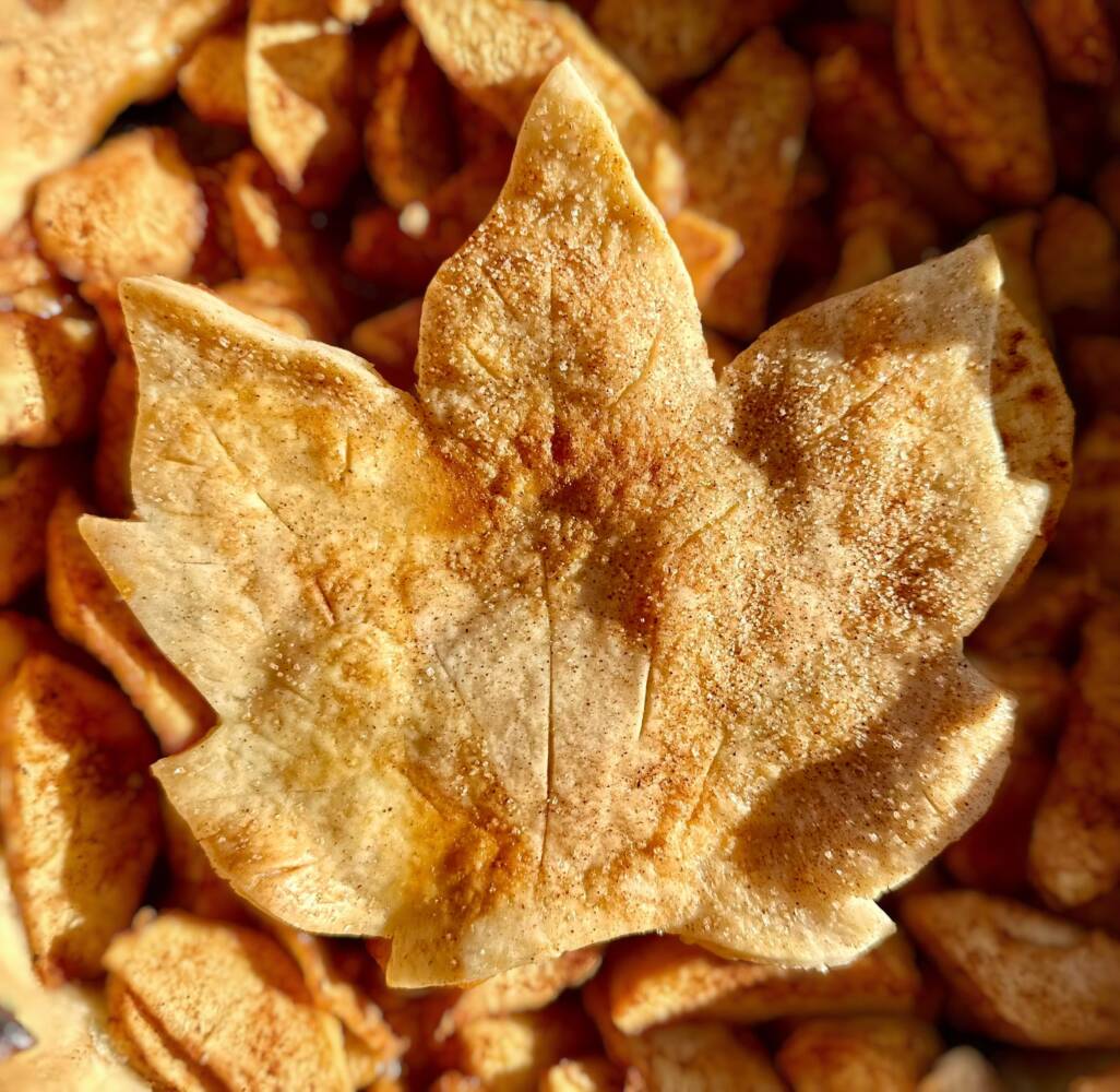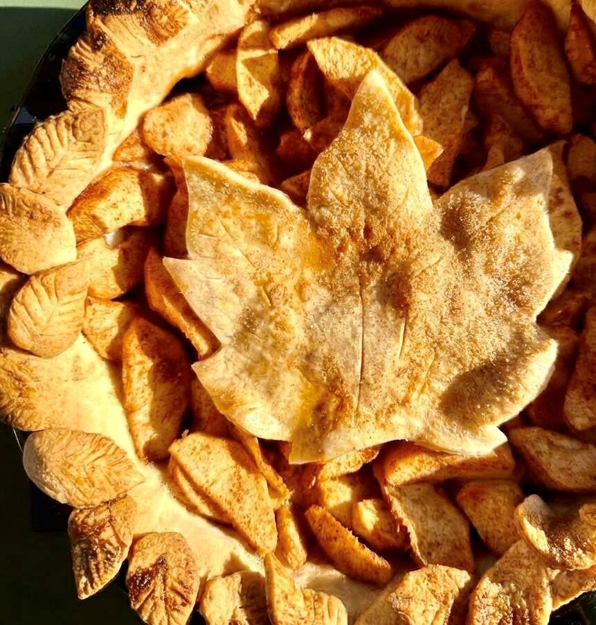 - If you have a second pre-made crust, lay it over the top, or create your lattice style of choice. I stamped out leaves and made a large leaf to top the center of the pie.