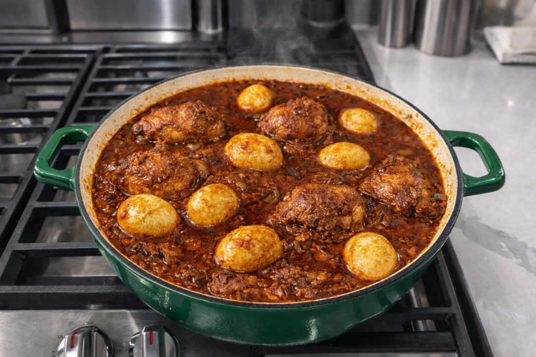 - Gently nestle the hard-boiled eggs into the stew during the last 15 minutes of cooking. Turn them carefully so they absorb the sauce. Adjust salt and heat as needed. Let rest 10 minutes before serving.